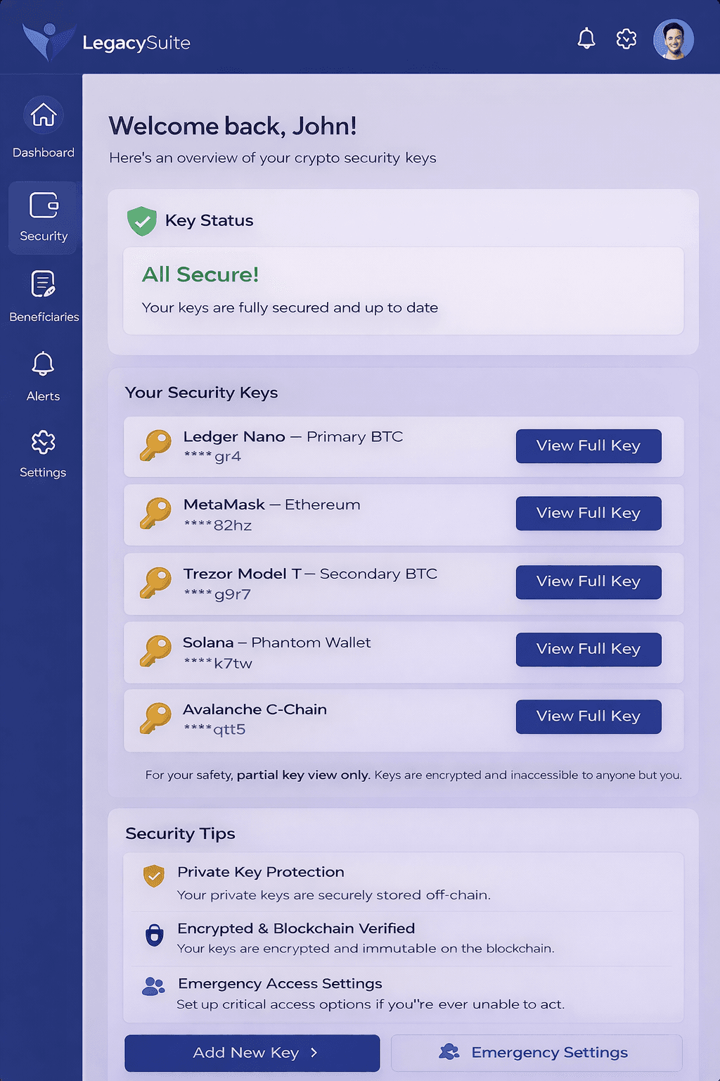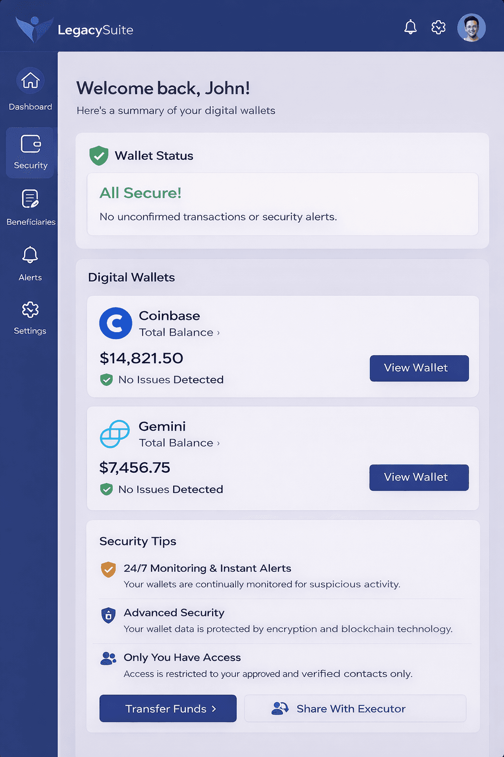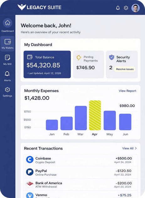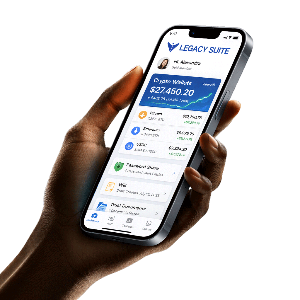 Legacy Suite is a comprehensive platform that modernizes estate planning by combining traditional legal tools with digital asset management and protection. It helps you organize, secure, and share important legal documents, crypto wallets, passwords, and digital files with your chosen beneficiaries.