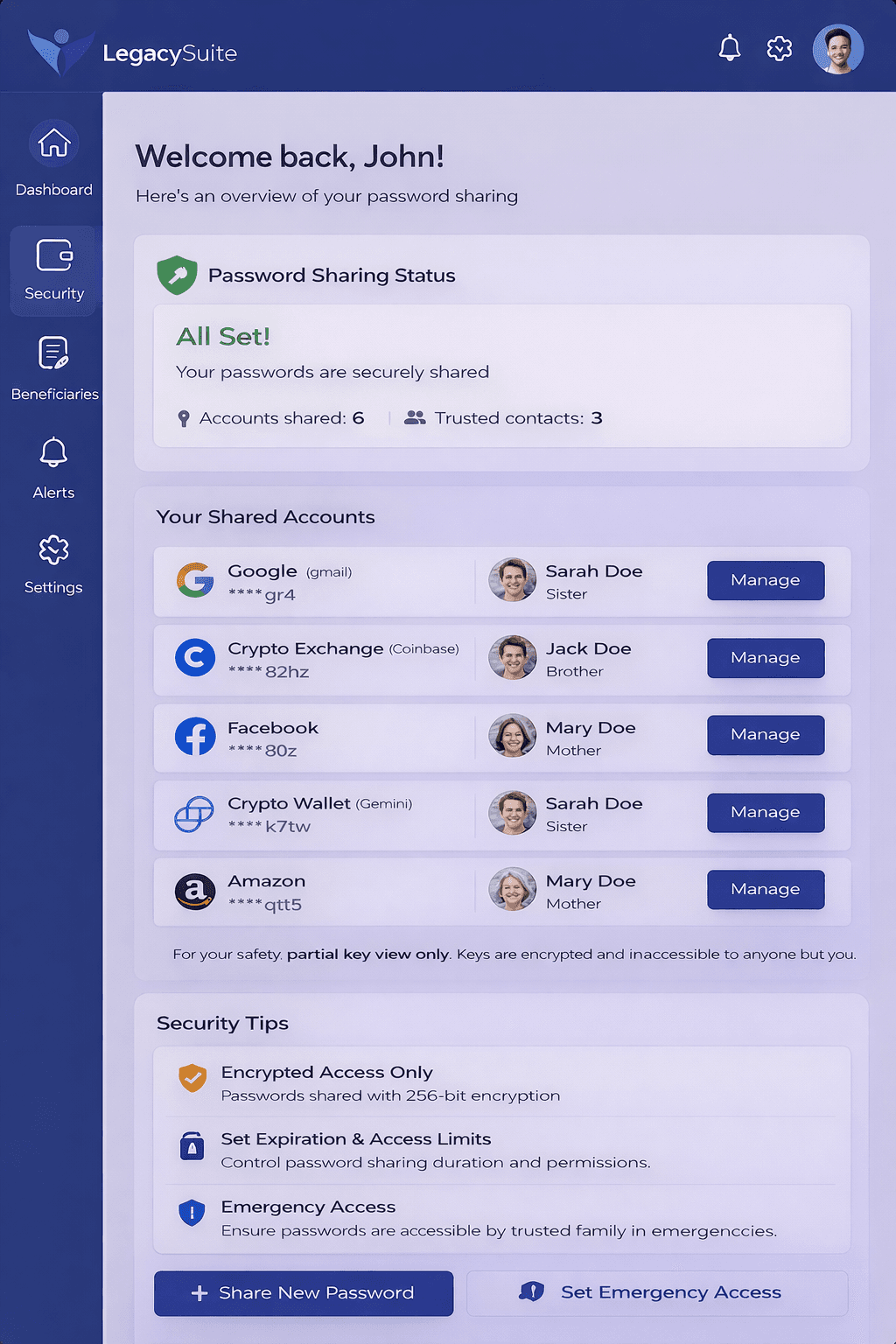 LegacyPass securely stores your passwords and crypto, and lets you decide who can access them and when.